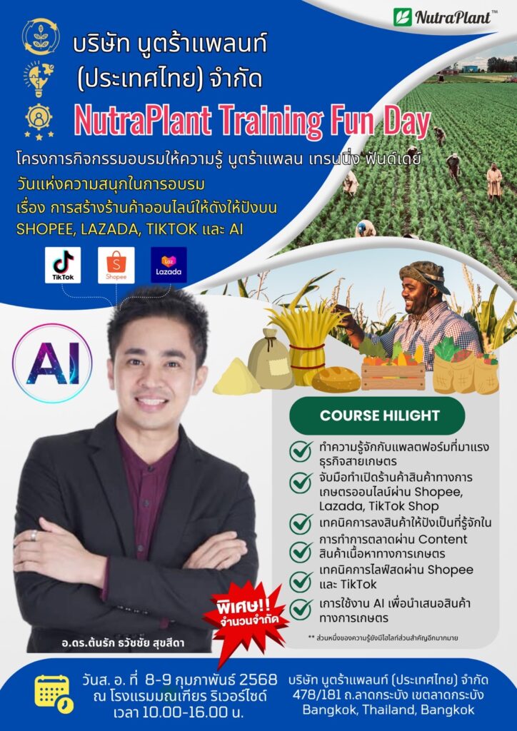 จัดโครงการกิจกรรมอบรมให้ความรู้ นูตร้าแพลนเทรนนิ่งฟันด์เดย์ Nutra Plant Training Fun Day วันแห่งความสนุกของการอบรม อบรมหลักสูตร เรื่องการสร้างร้านค้าออนไลน์ให้ดังให้ปังบน SHOPEE, LAZADA, TIKTOK และ AI สำหรับนักวิชาการเกษตร ผู้ประกอบทางการเกษตรและเกษตรกรผู้สนใจที่ต้องการสร้างตัวตนสร้างร้านค้า ทำการตลาด สร้างรายได้ในโลกอนไลน์ เข้าร่วมอบรมในหลักสูตรนี้ ซึ่งมี